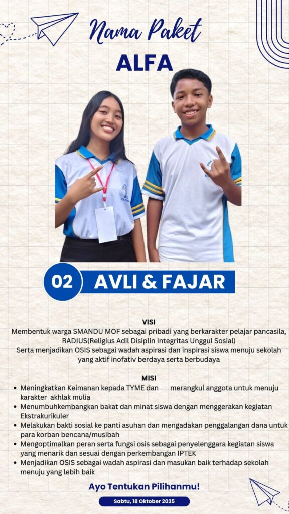 Membentuk warga SMANDU MOF sebagai pribadi yang berkarakter pelajar pancasila, RADIUS(Religius Adil Disiplin Integritas Unggul Sosial)